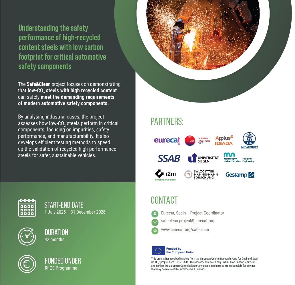 The Safe&Clean addresses these challenges by analysing two industrial use cases and evaluating how cleaner and sustainable steels perform in high-responsibility automotive parts. The project will analyse the influence of impurities present on steel grades processed by low-CO2 production routes on critical aspects related to steel manufacturability and safety performance. Special focus will be put on key safety factors such as crash performance, fatigue behaviour, weldability, and structural integrity of assembled components. Additionally, Safe&Clean will provide efficient testing methodologies to accelerate the validation and acceptance of scrap-based high-performance steels for automotive applications.